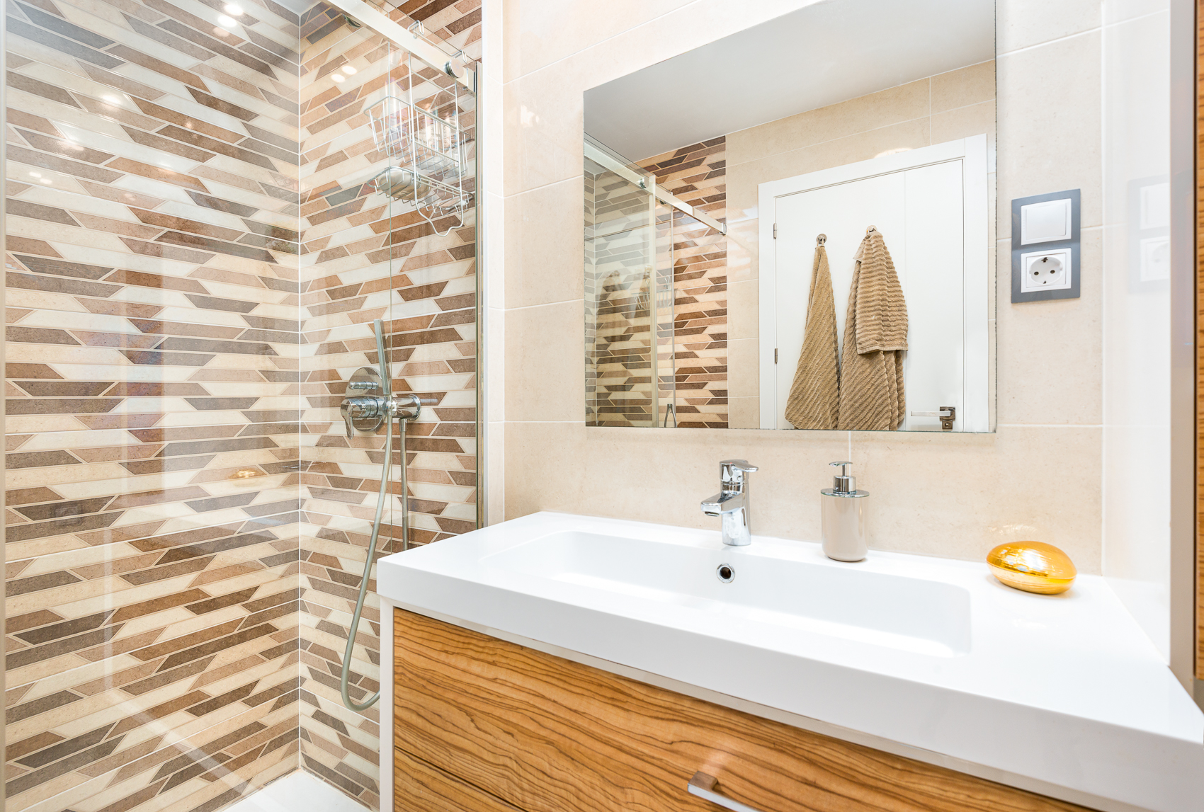 A showcase of designer details, the en-suite features stunning geometric tilework that creates a sophisticated and modern aesthetic.