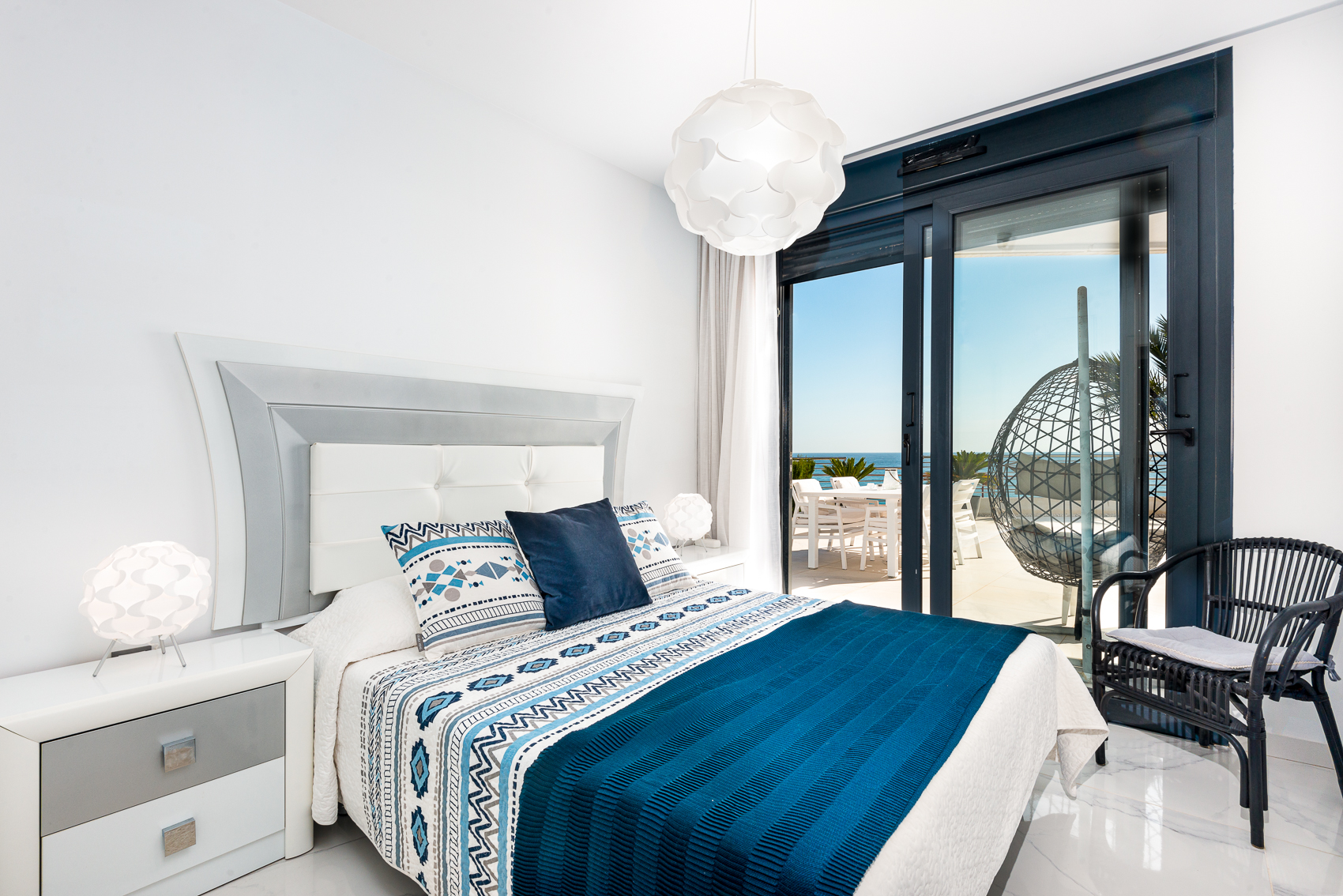 Stylish second bedroom with sea views and direct terrace access.